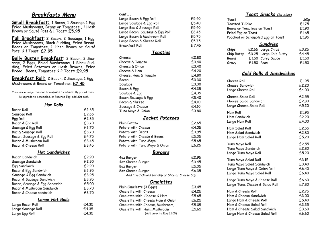 Staff are very friendly. Food is lovely and doesn't take long to prepare. You are able to sit inside with clean tables, chairs and condiments provided to add to your meal. There is a menu with prices and asking you to mention any dietary requirements you have before placing your order. They're not called belly busters for nothing. A large chips is huge, well worth the money. A large breakfast roll is a baguette - over 12 inches long. I can honestly say that the cafe provides quality and quantity. Worth the money - recommended!
